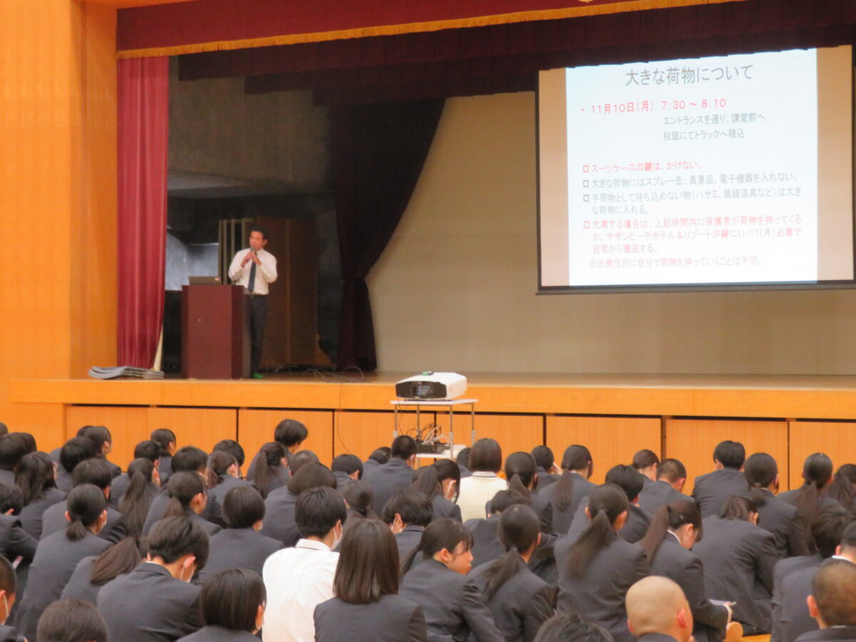 11月5日 (水) 6限の時間に大体育館にて、高校2年生を対象とした学年集会を実施しました。まもなく迎える沖縄修学旅行について、JTBの引率職員の方をお招きして持ち物や日程などについての最終確認を行いました。