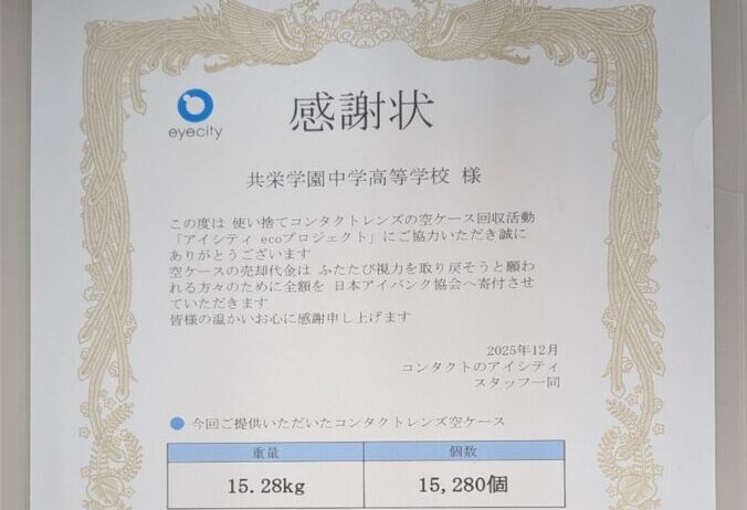 1月23日 (金) ボランティア部使い捨てコンタクトレンズの空ケース回収運動に貢献アイシティから感謝状
