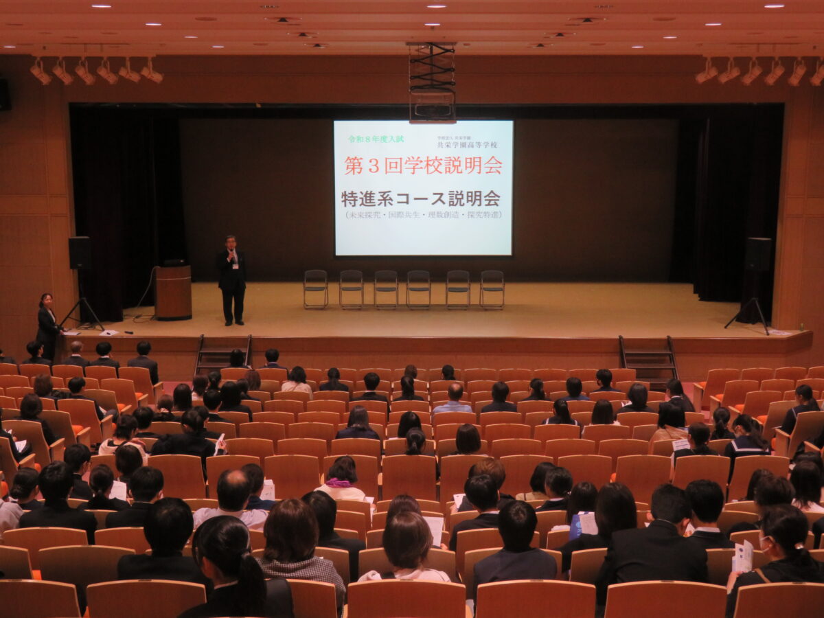 第3回高校説明会を実施しました。大体育館での全体会のあと、講堂での特進コース説明会や、5階理科室でのレゴ®エデュケーション体験会を行いました。特進コース説明会では、各コースに在籍している高校2年生が登壇し、インタビュー形式でコースの特色をご説明いたしました。お越しいただいたみなさま、ありがとうございました。