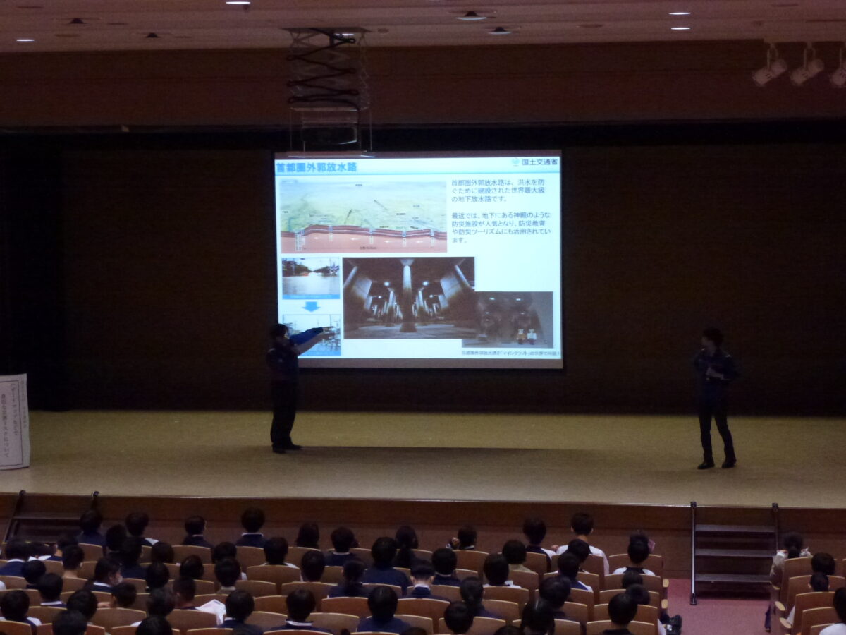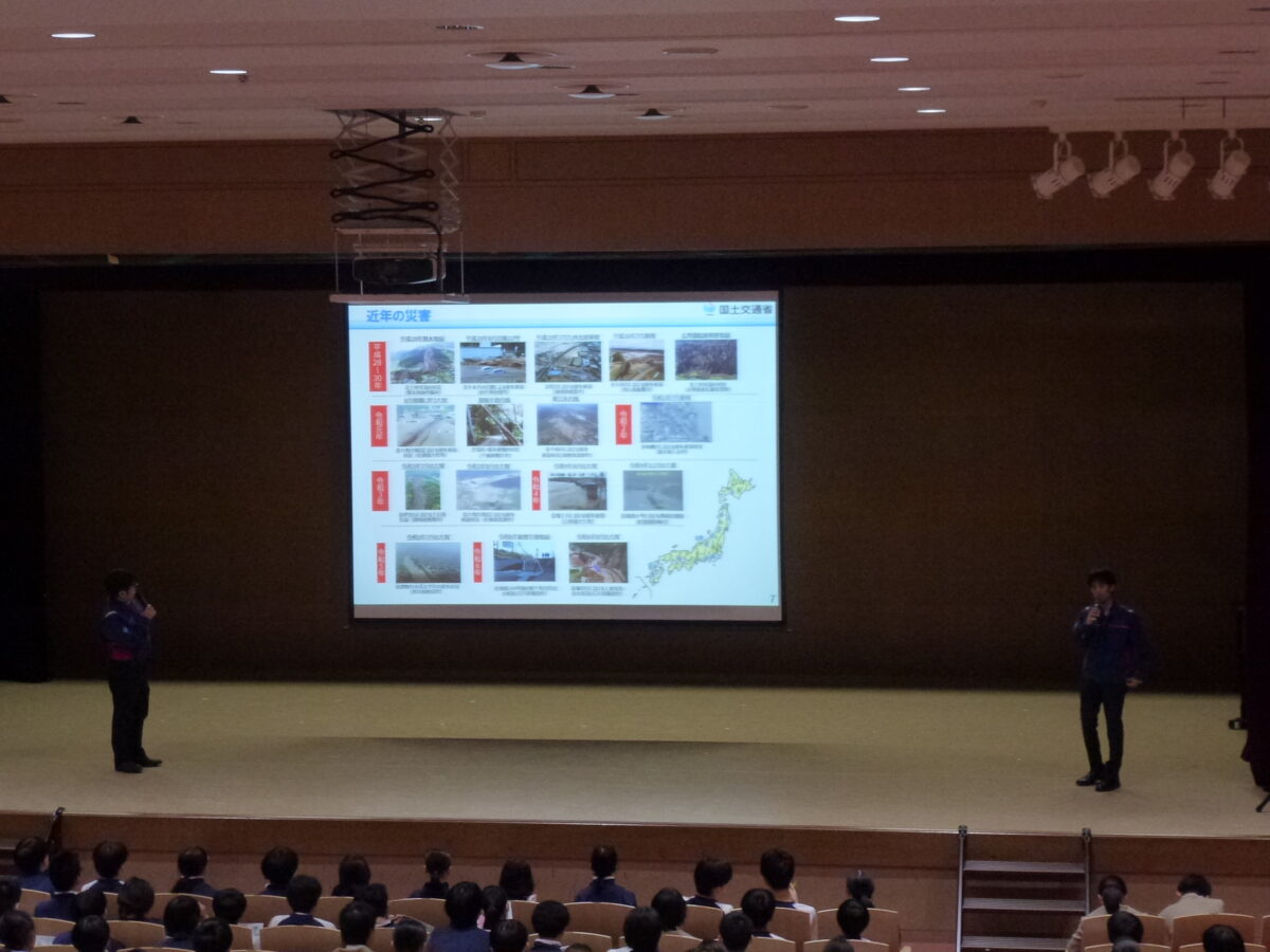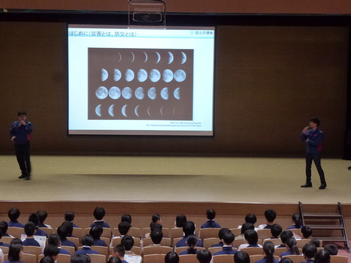 6限の時間に講堂にて、中学生を対象とした講演会を実施しました。国土交通省の水管理・国土保全局防災課の職員の方をお招きし、「ハザードマップなどで身近な災害リスクについて学ぼう!」というテーマで講演をしていただきました。中学生のみなさんにとって、とても有意義な講義内容となりました。