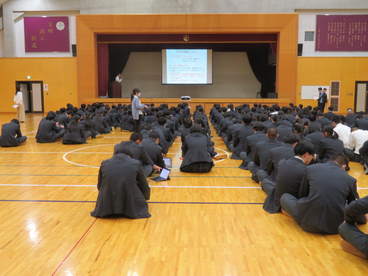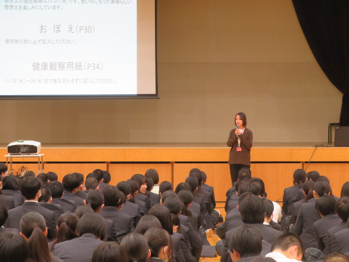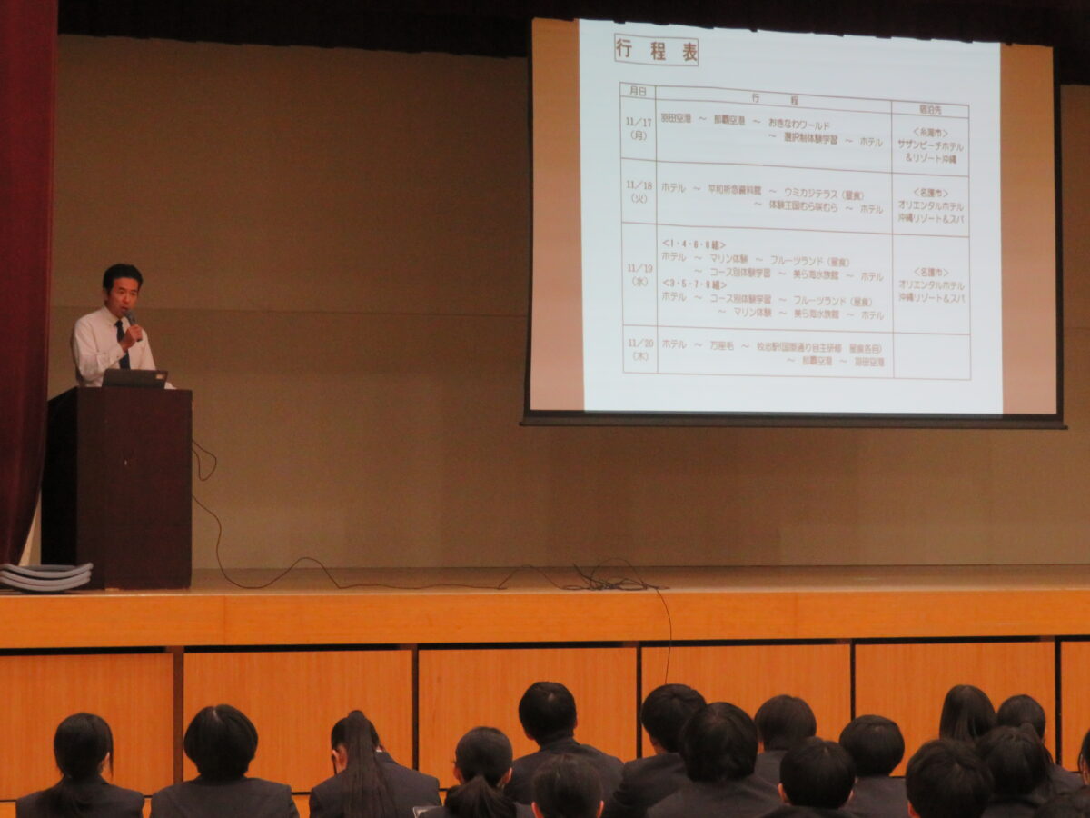 6限の時間に大体育館にて、高校2年生を対象とした学年集会を実施しました。まもなく迎える沖縄修学旅行について、JTBの引率職員の方をお招きして持ち物や日程などについての最終確認を行いました。