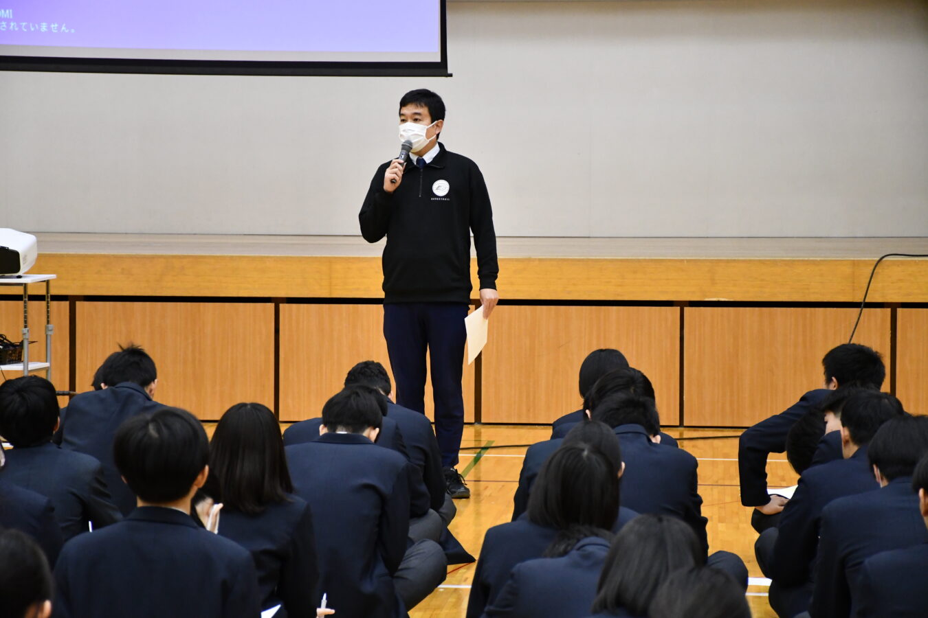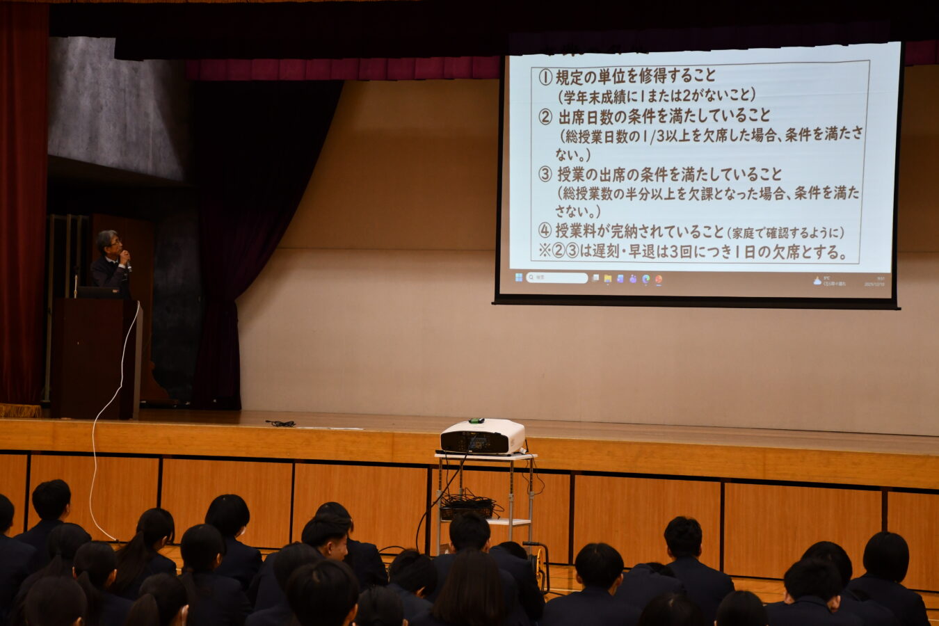 2限の時間に大体育館にて、高校3年生を対象とした学年集会を実施しました。これから大学入試を迎える生徒のために、3学期の授業について教務部の先生からお話がありました。まずは1月の共通テストに向けて、後悔のないように全力を尽くしましょう。