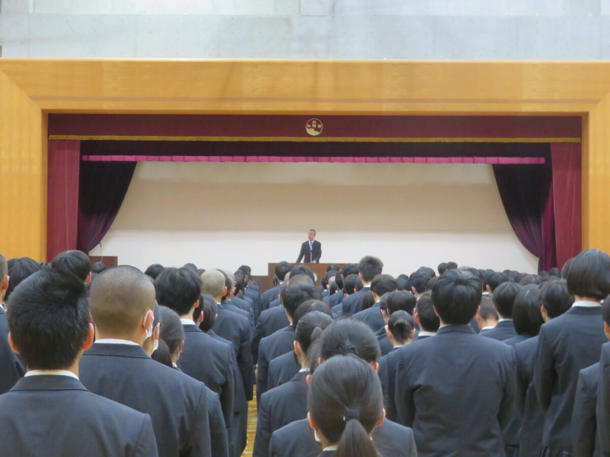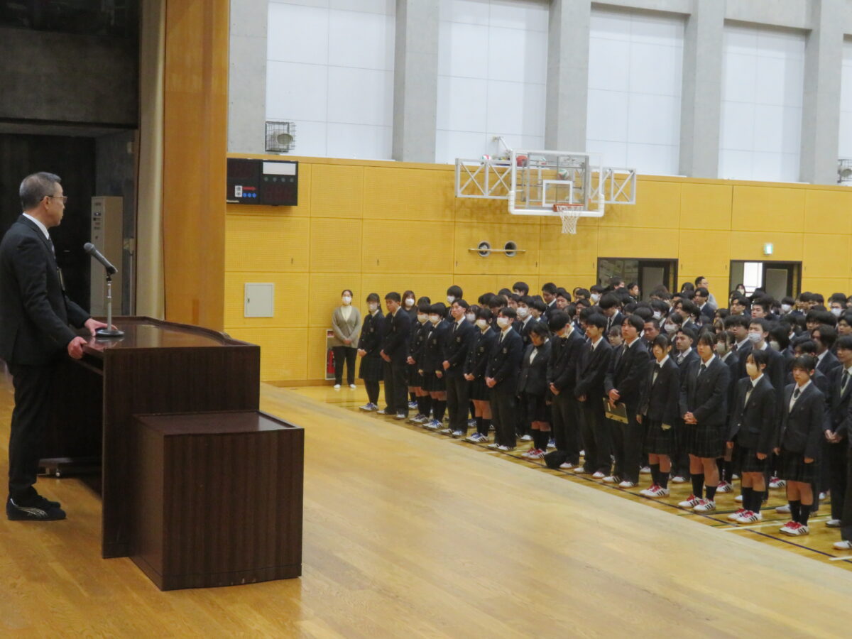 大体育館にて、2学期終業式を実施しました。校長先生から、あいさつをする生徒が増えたいへん喜ばしいとのお話がありました。また、生徒指導部長の先生から冬休みについての過ごし方や、教頭先生から2学期に検定取得や部活動などで活躍した生徒の紹介がありました。生徒のみなさん、冬休みも規則正しく有意義に過ごしてください。