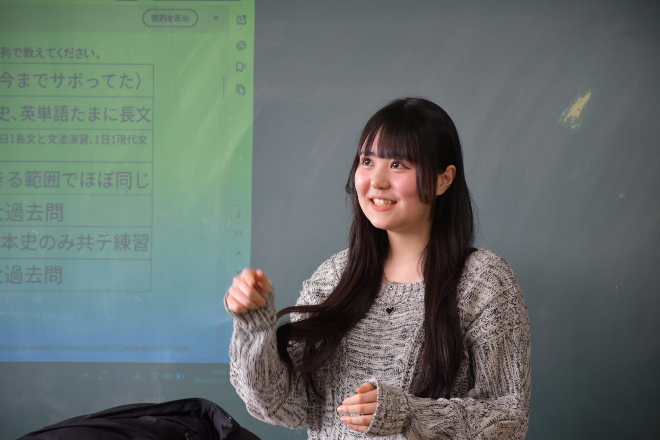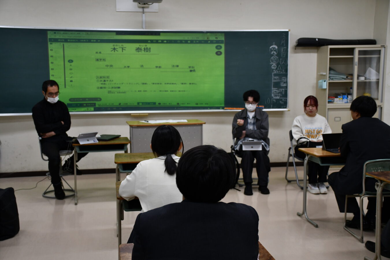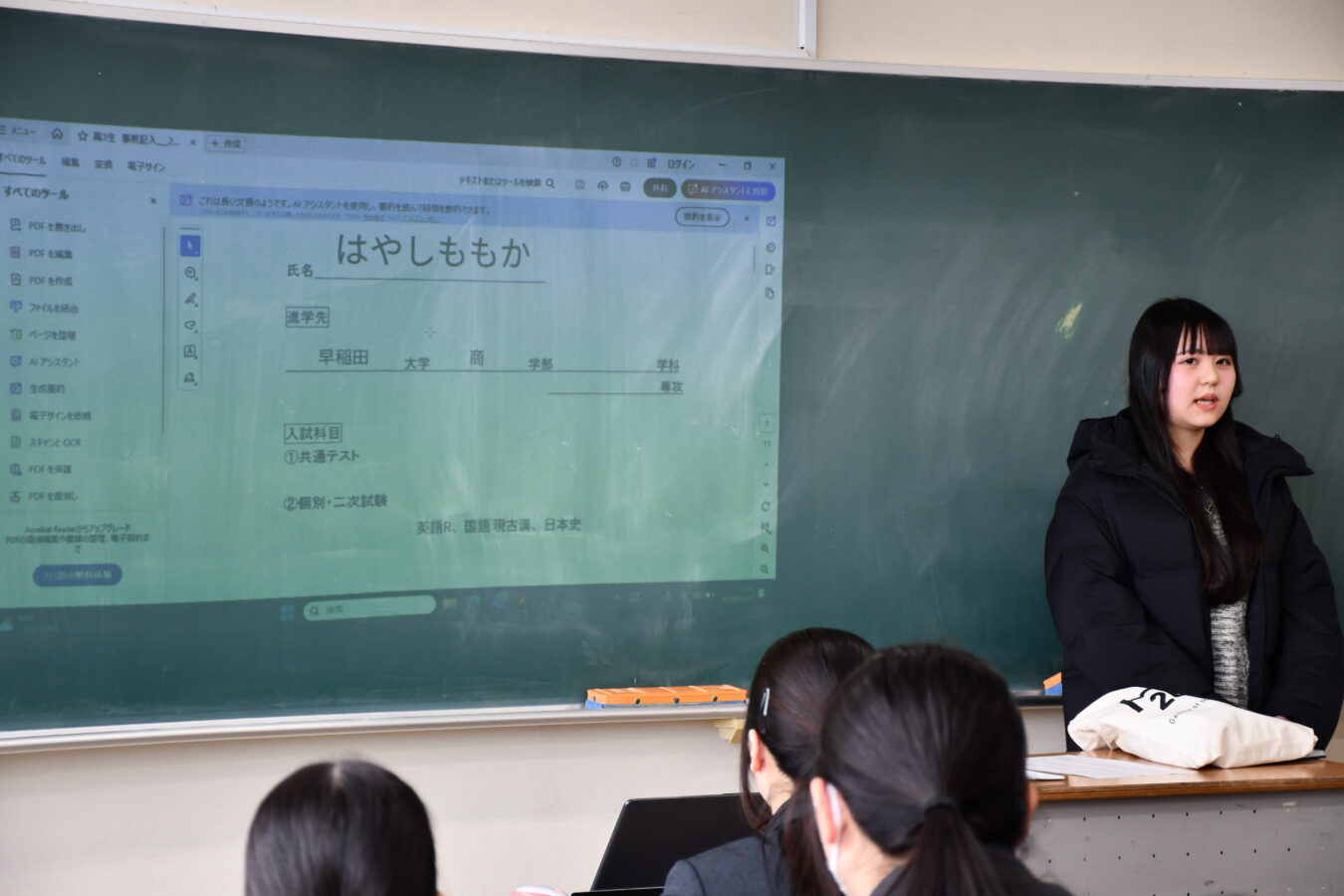 3限の時間に高層棟5階の各教室にて、高校2年生・3年生を対象とした進路懇談会を実施しました。先日卒業したばかりの高校3年生を招いて、これから受験生となるみなさんに向けて講演をしてもらいました。早稲田大学・お茶の水女子大学・東京農工大学・中央大学・東京理科大学など、難関校の合格を一般入試で勝ち獲ったみなさんからのアドバイスは、とても参考になったようでした。
