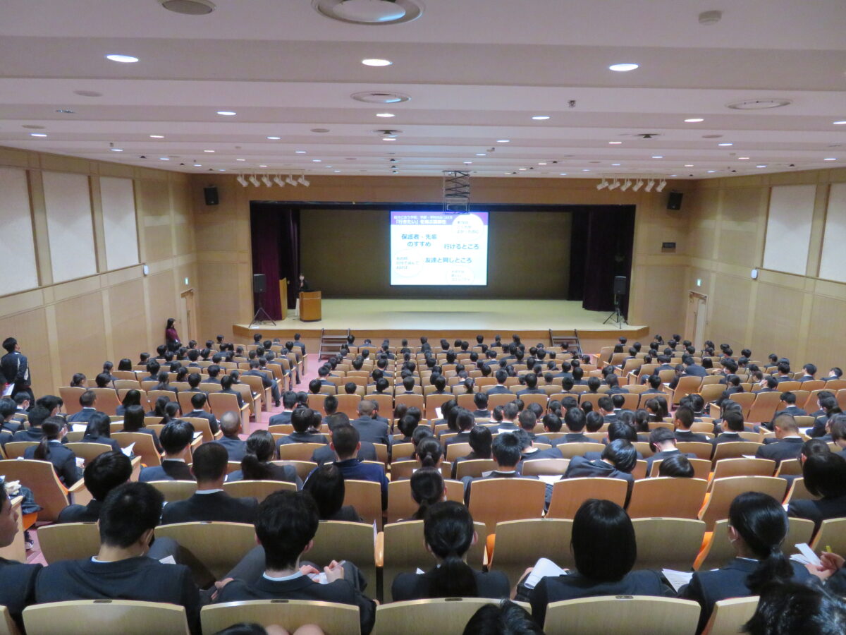5限に講堂にて、高校2年生を対象とした進路ガイダンスを実施しました。「志望理由の組み立て方」というテーマで、外部の方をお招きして講演をしていただきました。生徒のみなさんはガイダンスに真剣に耳を傾けていました。
