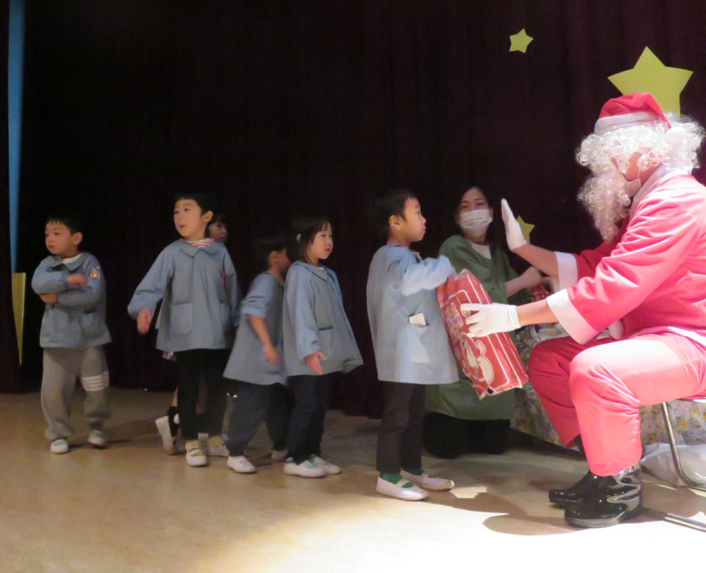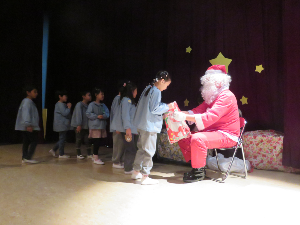 共栄幼稚園のよい子の所にサンタさんが来てくれました。冬休みになるとみんなに会えなくなってしまうのでいきますよって幼稚園に連絡がありました。